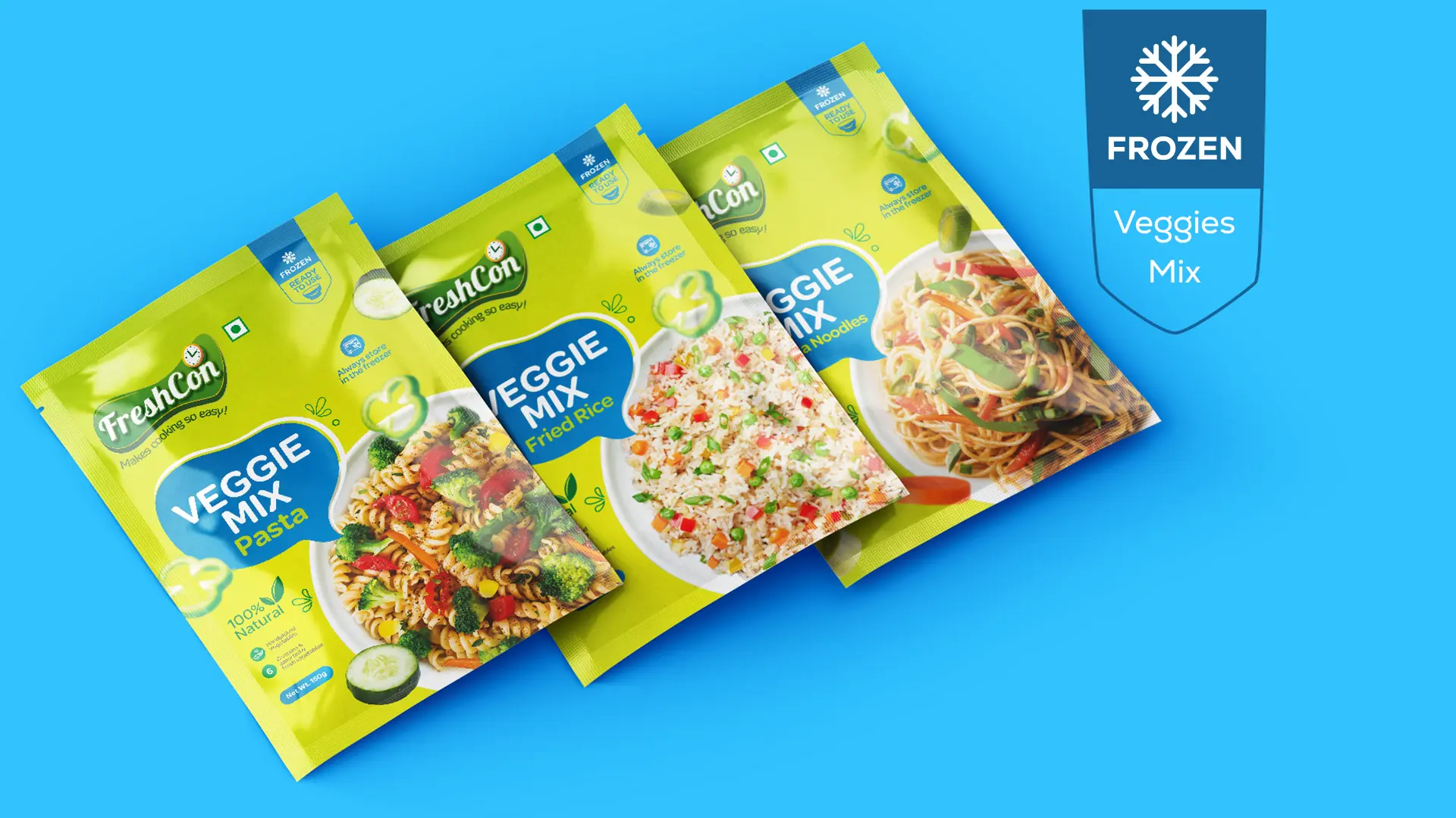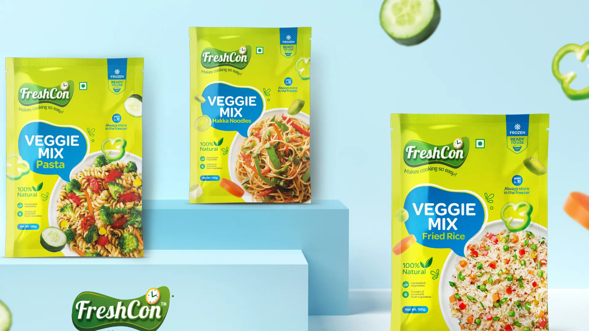 The project focuses on building a unified and playful packaging identity for FreshCon by developing a visual language that stays consistent across all product types. Each category like frozen and ready-to-cook was given distinct colours and cues while retaining core brand elements like the curved shape, clock icon, and vibrant tone. Interactive elements such as step-by-step line illustrations and fun callouts were added to make the packaging more engaging, clear, and true to FreshCon’s friendly, time-saving promise