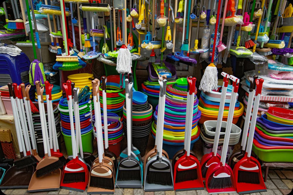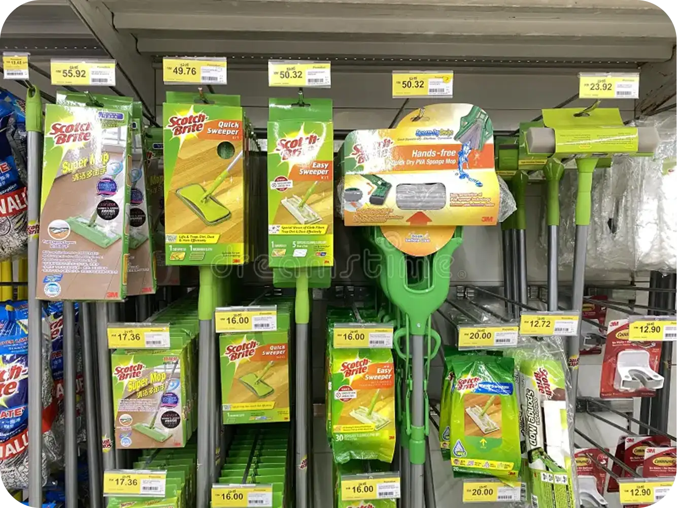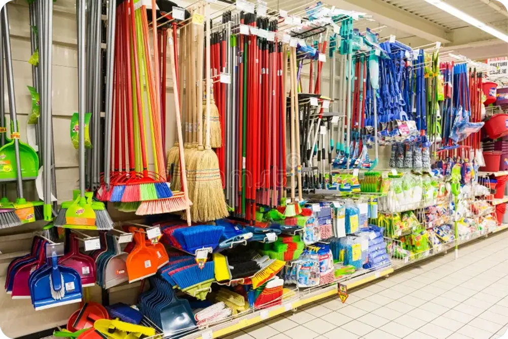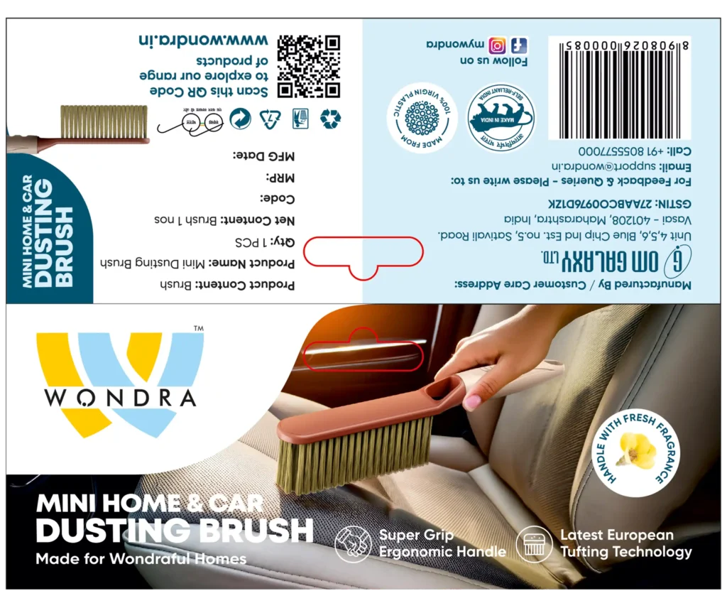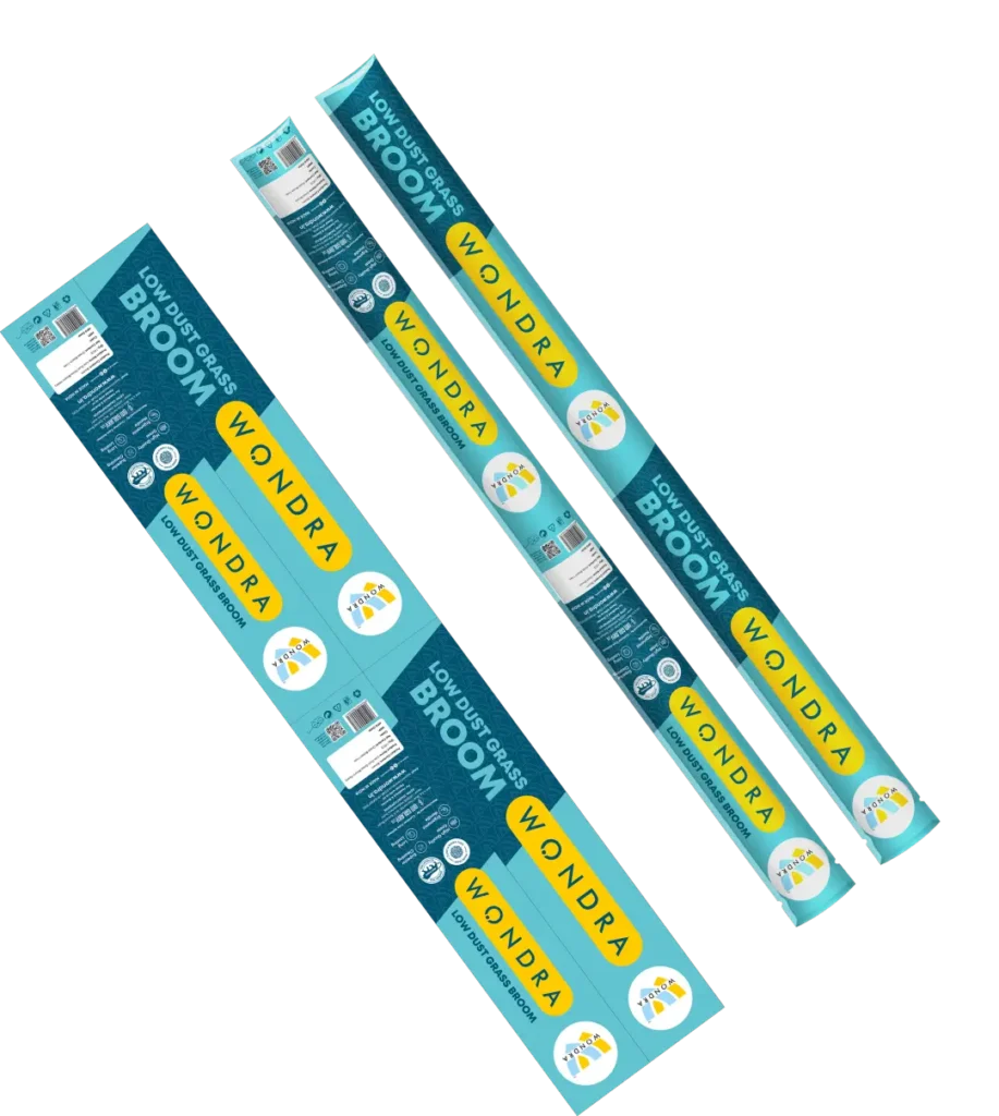 A durable vertical sleeve with branded print that protects the broom while ensuring high shelf visibility and easy recall in crowded retail spaces.